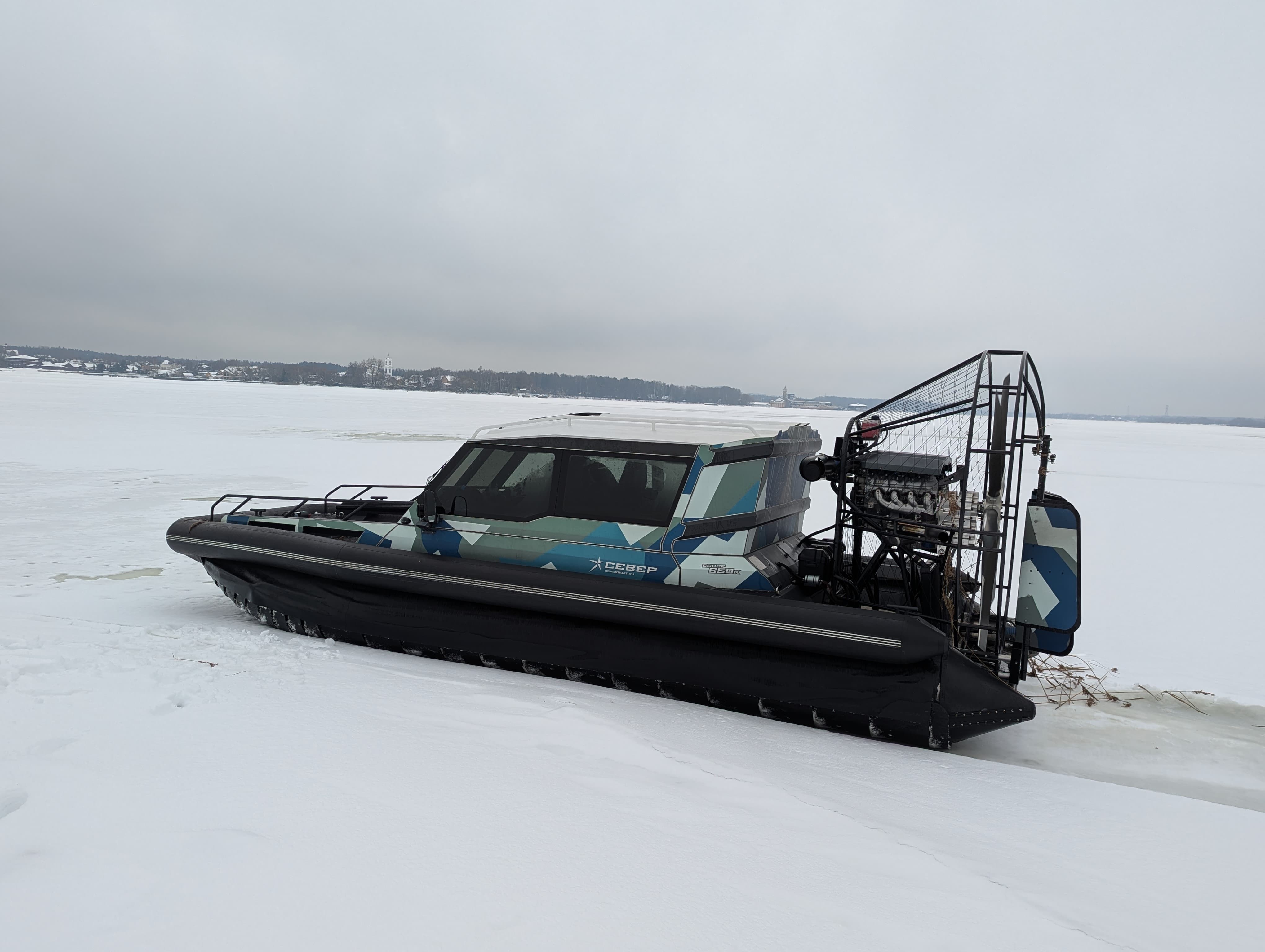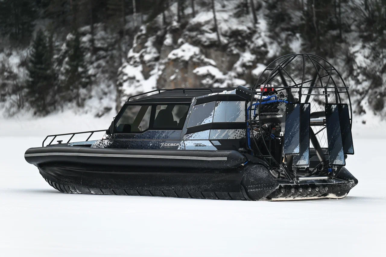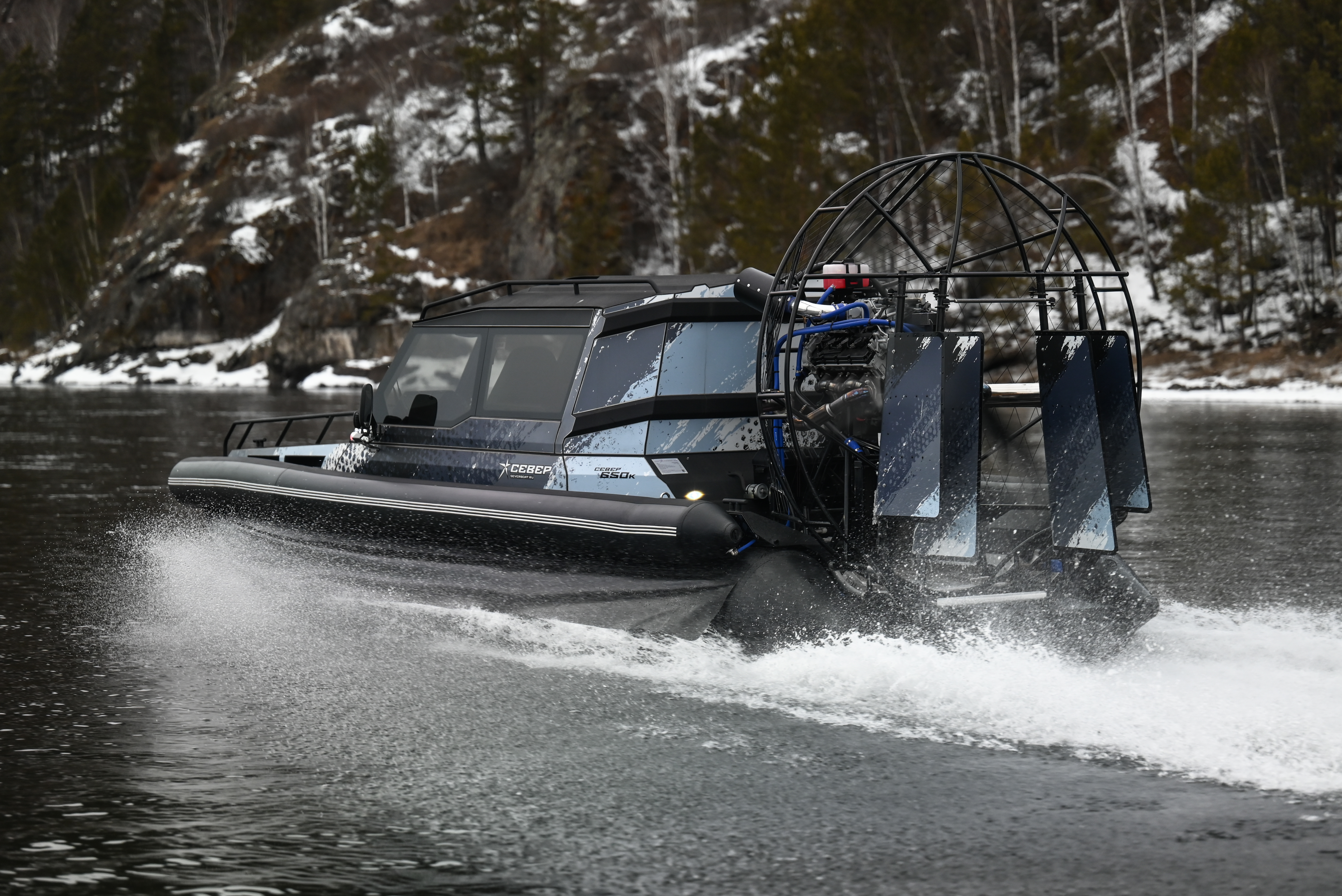 Модель на тест-драйв которой нас позвали — аэролодка «Север 650К» обладает вместимостью до 8 человек и грузоподъемностью до 1500кг.
