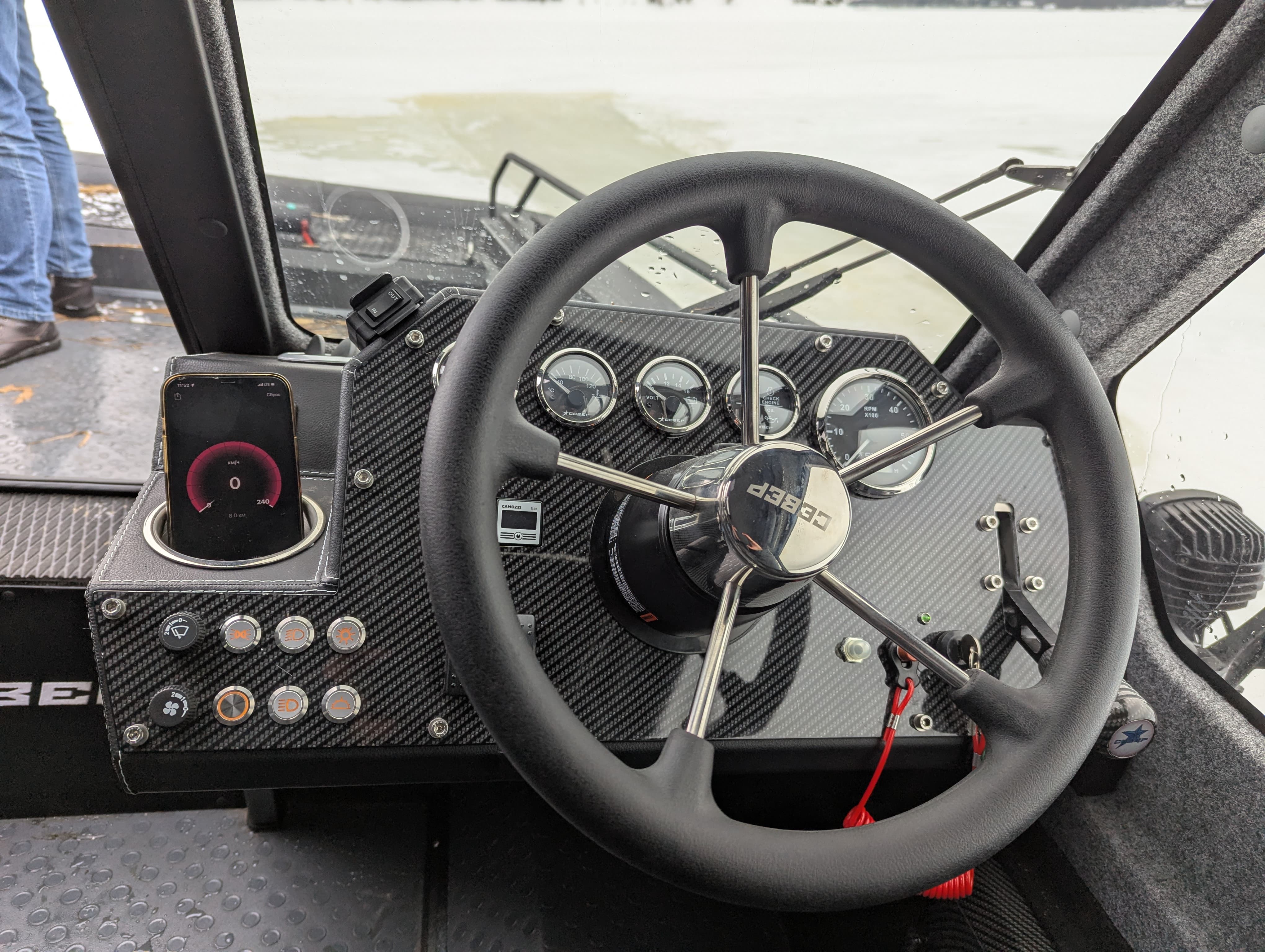 Интерфейс приборной панели интуитивно понятен и прост в использовании. Перед капитаном лодки находится панель управления, на которой расположены рулевая колонка, рулевое колесо, замок зажигания, рукоятка управления дроссельной заслонкой (газом), тумблер переключения отопителя, тумблер включения фар, тумблер включения ходовых огней, тумблер включения дворников, кнопка аварийного выключения зажигания с чекой, кнопки автоматических выключателей «массы» двигателя с индикатором и прикуриватель.