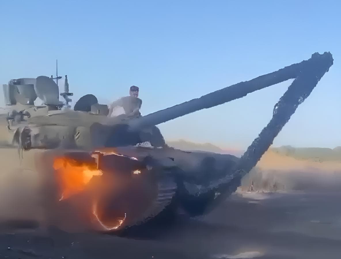 На видео можно заметить, что у Т-90М пострадал передний сектор правой надгусеничной полки с повреждением и возгоранием топливного бака после атаки дрона-камикадзе.