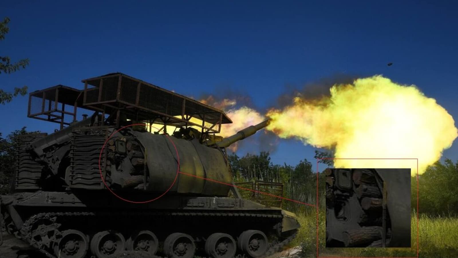 Боковая проекция артиллерийской прикрыта брёвнами, соединенными между собой резиновыми листами. Сверху установлен сварной металлический «мангал». Аналогичные конструкции применяют для инженерных машин или легкобронированной техники.