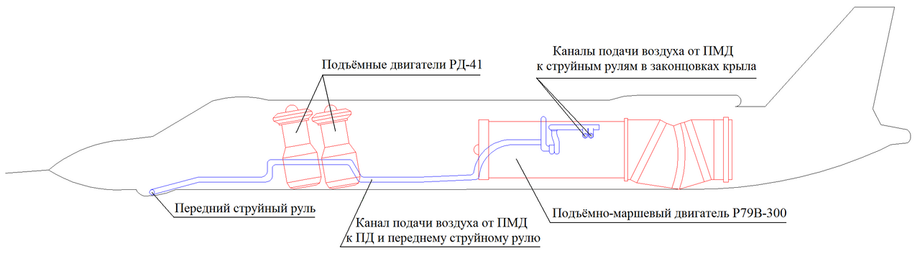 Первоначально планировалось разместить два подъёмных двигателя в носовой части самолёта, но позже была выбрана схема Як-38 с размещением отсека с ПД за кабиной пилота. Конструкторам пришлось использовать нестандартную схему с двумя консольными балками для размещения вертикального оперения и стабилизаторов.