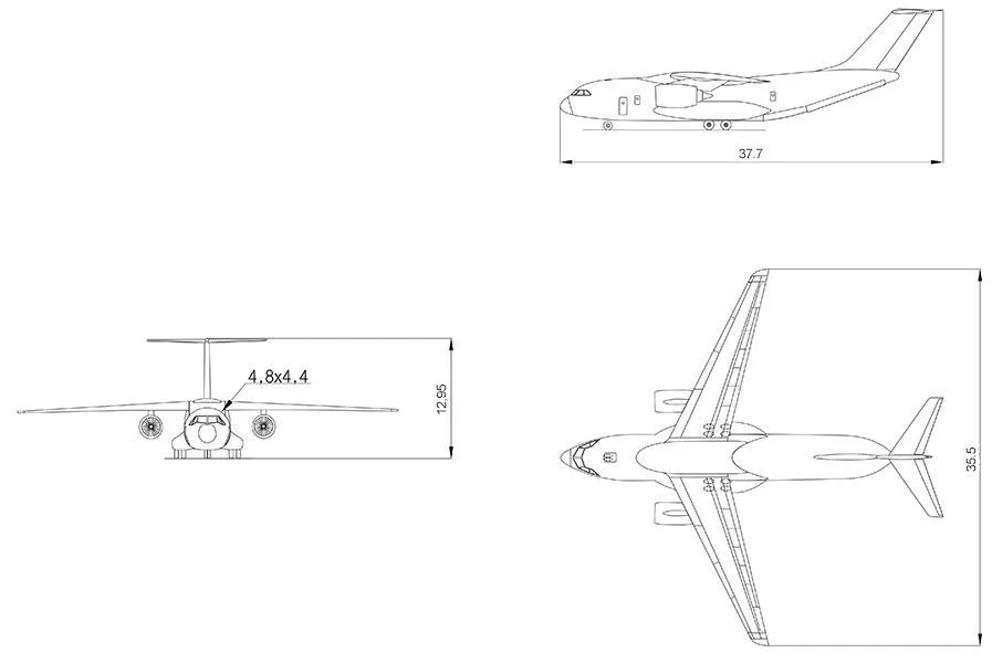 Размеры грузовой кабины должны были быть идентичны Ил-76МД-90А, что позволило бы использовать существующую инфраструктуру. Самолёт должен был обеспечивать автономное решение транспортных задач и подготовку к вылету силами экипажей. Бортовое радиоэлектронное оборудование планировалось построить «на открытой архитектуре», с единым информационно-управляющим полем кабины пилотов, 6 ЖК-дисплеями и 2 ЖК-индикаторами на лобовом стекле.