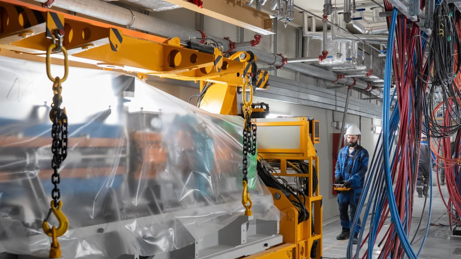 Один гирдер с оборудованием весит порядка 10 тонн, поэтому от места сборки — корпуса стендов и испытаний — в здание накопителя сегменты кольца доставляет грузовой автомобиль, по тоннелю оборудование перевозит специальный «умный» тягач — беспилотная грузовая тележка.