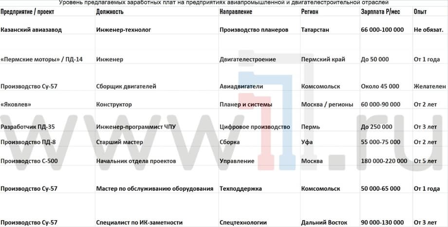 От 45 тыс до 250 тысяч рублей — реальные зарплаты по вакансиям в самолётостроении и двигателестроении