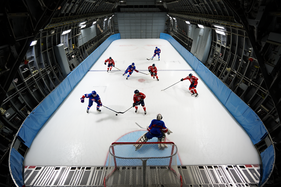 Вместо настоящего льда в грузовом отсеке «Руслана» уложили специальное пластиковое покрытие, имитирующее лёд, как в предсезонной подготовке профессиональных клубов.