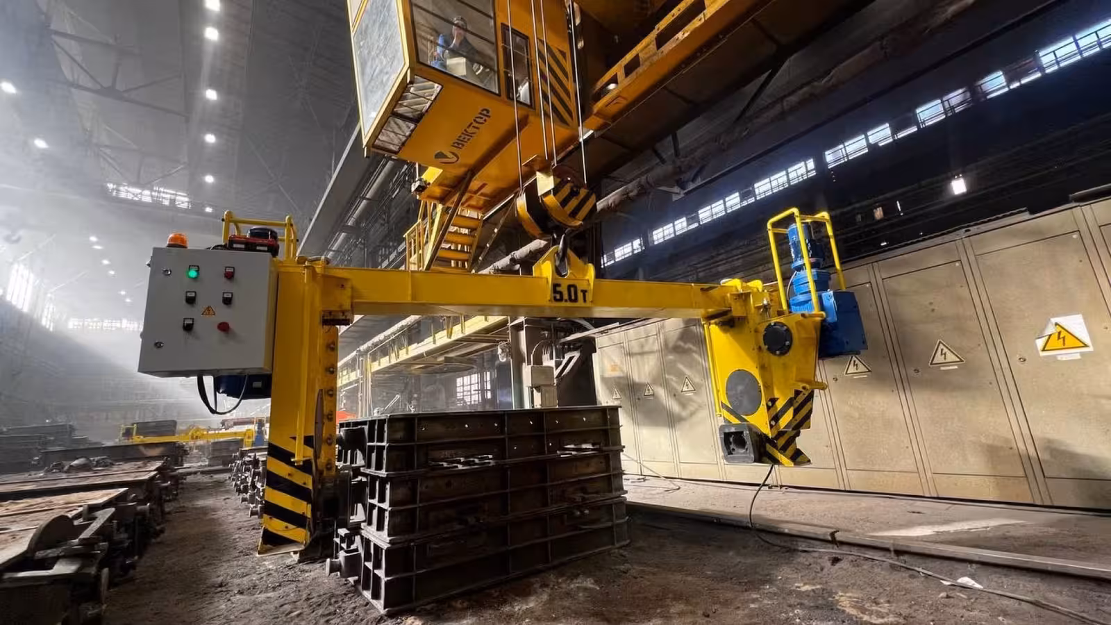 Specialized load gripping device is suspended on cranes of various types