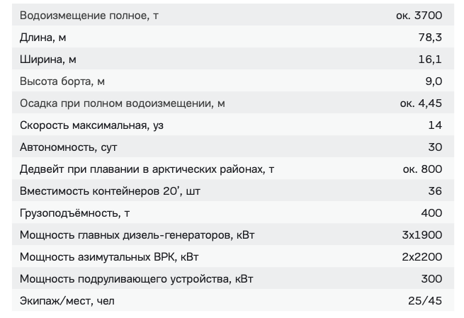 "Vladimir Pyalov" has a full displacement of more than 3600 tons, and its length is about 80 meters. It has high seaworthiness and cruising range. The vessel is equipped with ice reinforcement of the hull, a double bottom and sides, and has two cargo holds, a platform for transporting goods in containers, a crane with a lifting capacity of 20 tons, and a bow helicopter landing pad.