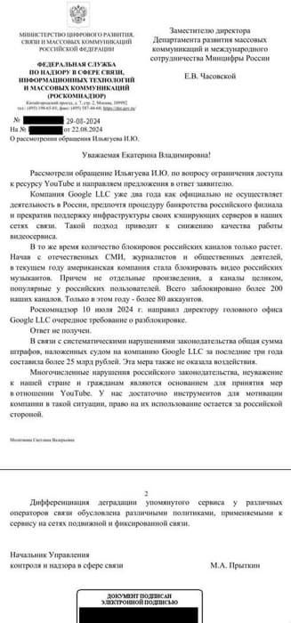 There is also data on the real reasons for slowing down the service. Roskomnadzor, in an official response to the Deputy Director of the Department of Mass Communications Development and International Cooperation of the Ministry of Digital Development of Russia, E.V. Chasovskaya, explained that the reason for these actions was the blocking of channels of famous Russian performers such as SHAMAN, Polina Gagarina, Oleg Gazmanov and Grigory Leps by Youtube. The department sent a letter to the office of Google LLC in Russia. When no response followed, it was decided to slow down the video hosting service.