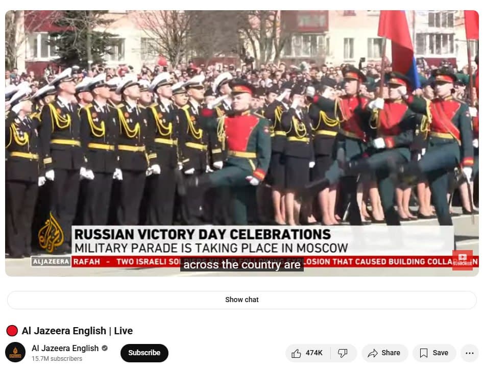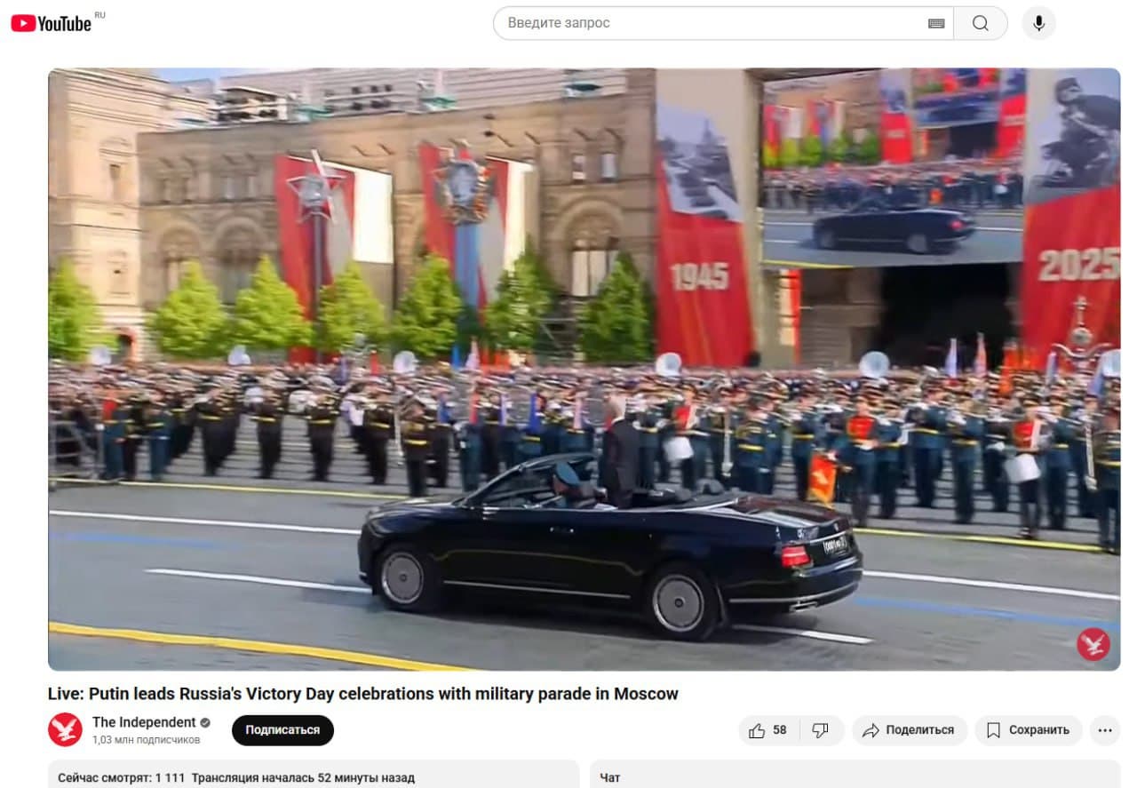 Leading Japanese TV channels Nippon TV, ANN News, TBS and NHK are showing the parade on YouTube, and the Turkish channel AHaber included a fragment of the parade in a live broadcast during a report from Moscow. In the Chinese version of TikTok (Douyin), several news channels are broadcasting the parade: on the channel of the Guancha information portal, the audience reached 1.93 million viewers, and on the popular news channel Kankan Xinwen - 305 thousand.