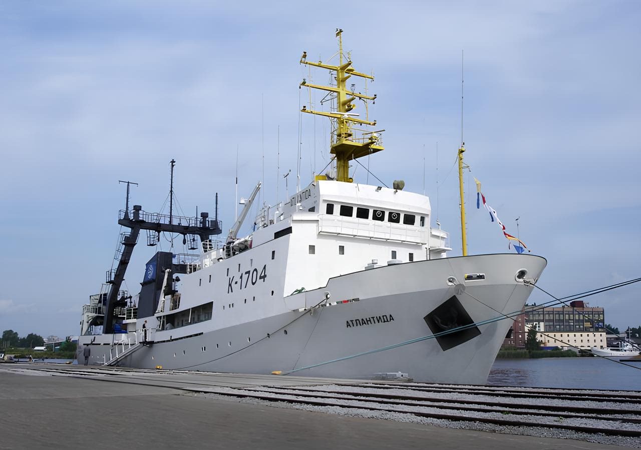 The vessel "Atlantida" K-1704 was built in 1987 at the shipyard in Stralsund, Germany. The ship's crew is about 40 people, including 11 scientists. The vessel is capable of performing research trawls with pelagic and bottom trawls to a depth of 1300 m. The processing of fish caught during experimental trawls into meal is carried out on a fish meal plant.