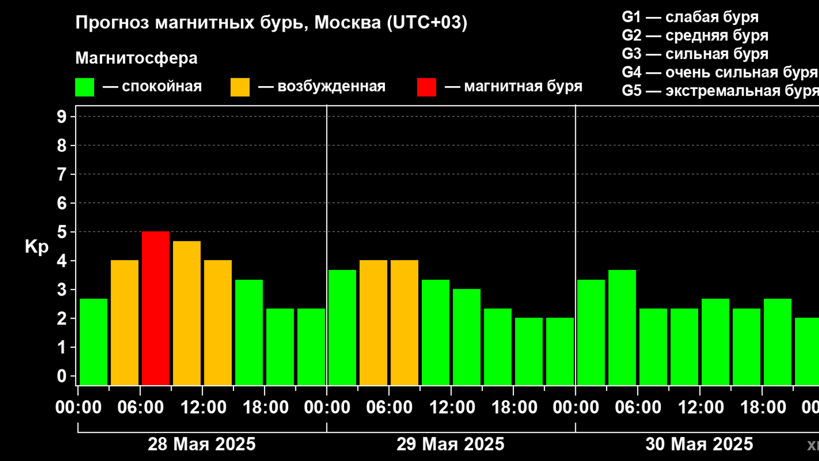 On May 28, 2025, a moderate magnetic storm (level Kp 6) occurred on Earth, caused by a series of solar flares recorded earlier. According to the Laboratory of Solar Astronomy of the IKI RAN, disturbances began in the morning hours (around 7-8 am).