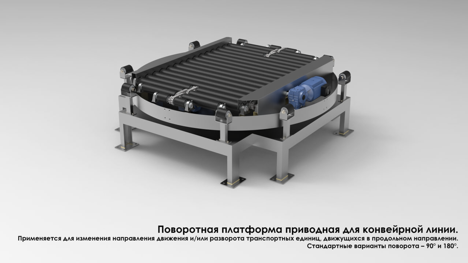 The main function of the platform is to change the direction of cargo movement without stopping the main conveyor flow. This is achieved by means of a rotating section driven by an electric motor. Torque is transmitted to the rollers via either a chain or belt drive. Engineers have provided the option of using a gear motor with speed control, which is critical for working with different types of cargo – from heavy pallets to fragile boxes of medicines or food products.