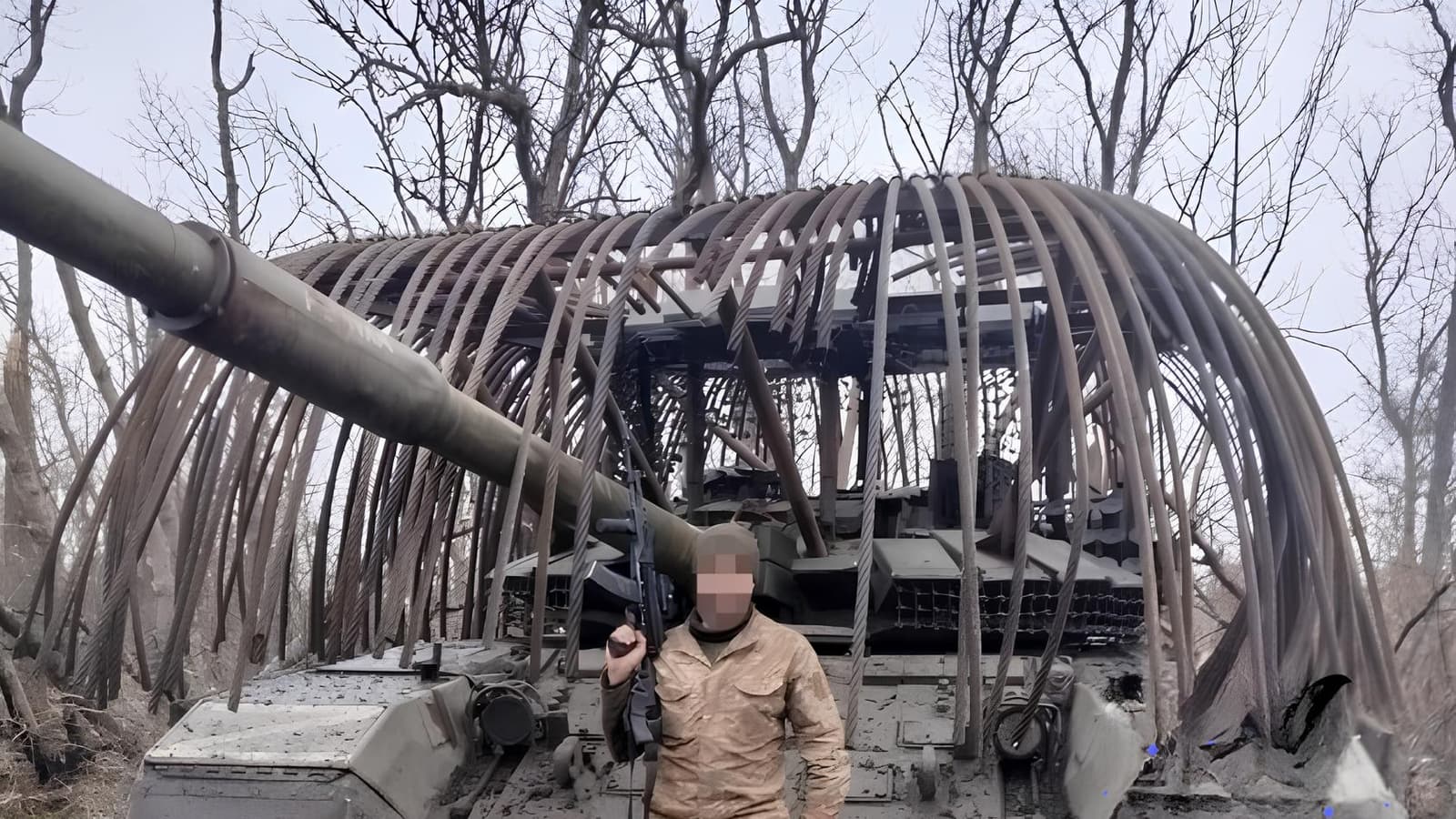 A tank with anti-drone protection in the form of rebar welded to the hull withstood about eight shell hits, according to repair company commander Vlad.