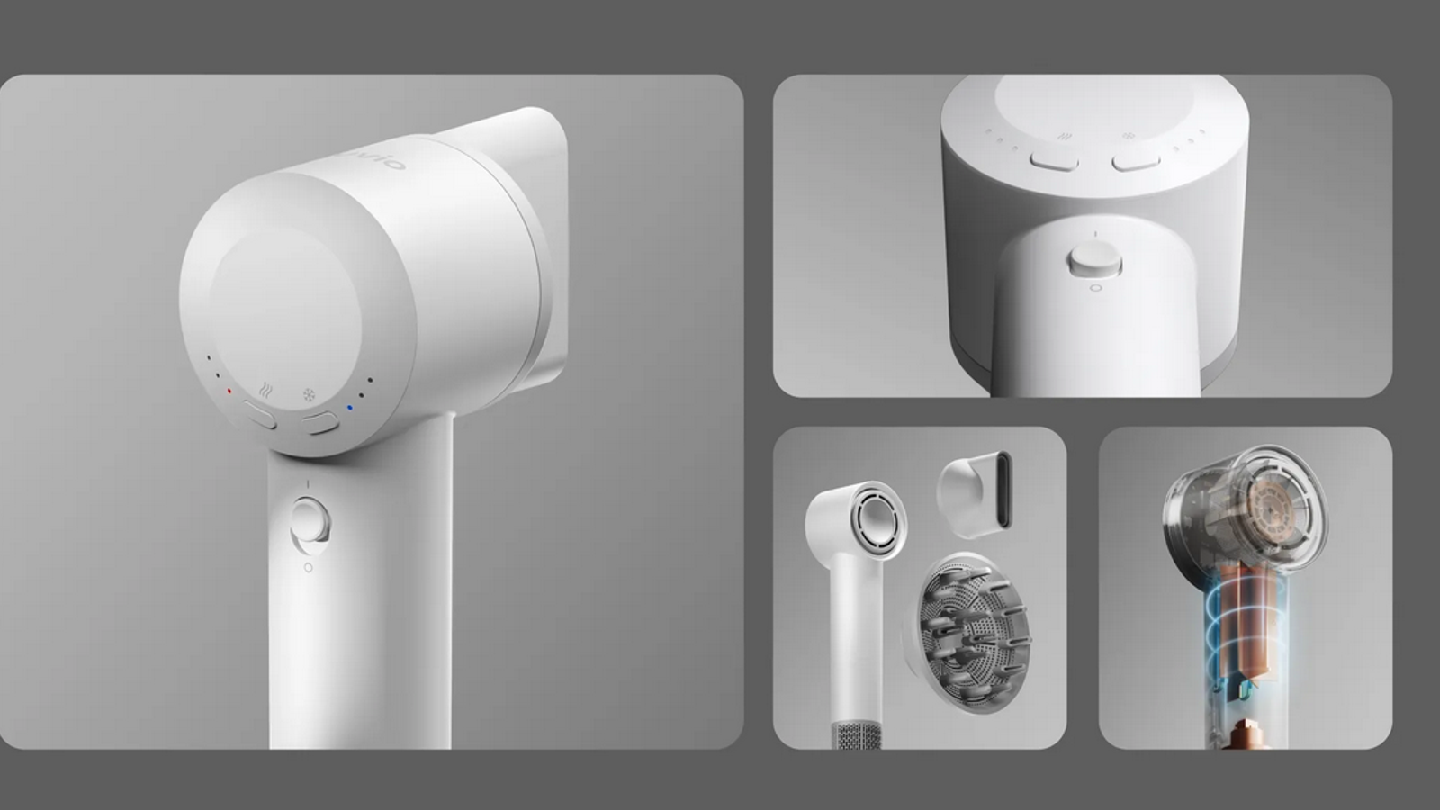 The Tuvio folding hair dryer weighs 552 grams and has a length of 21.5 cm. The model also uses a brushless BLDC motor, but with a power of 1600 W. The device offers four temperature and two speed modes, as well as ionization and overheating protection. The kit also includes a concentrator and a diffuser.