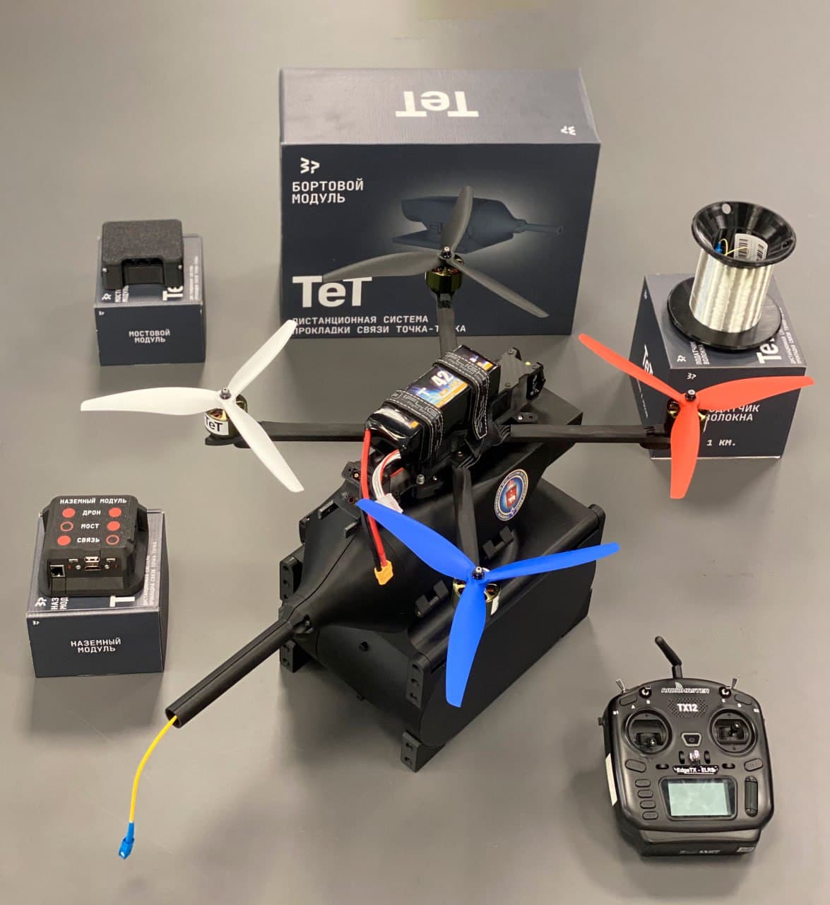 Russian engineers have developed the "Tet" remote communication laying system. It is a drone for the rapid deployment of a secure communication line up to 20 km. It is based on a fiber optic cable, which the drone unwinds in flight.