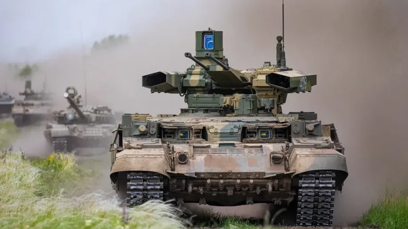 The vehicle is equipped with Relikt dynamic protection and ammunition located outside the armored volume. The BMPT's arsenal includes two AG-17 grenade launchers, two 2A42 30 mm cannons, anti-tank missiles, and a machine gun.