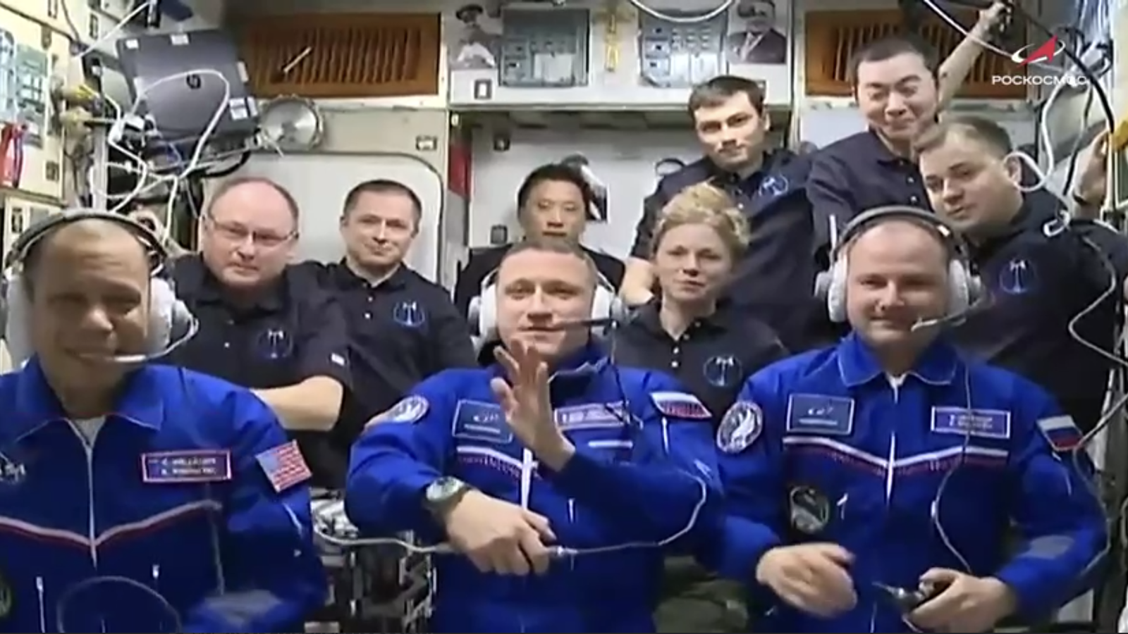 Cosmonauts Sergei Kud-Sverchkov, Sergei Mikaev, and Christopher Williams were greeted on board the ISS by members of the 73rd long-term expedition: Sergei Ryzhikov, Alexei Zubritsky, and Oleg Platonov from Roscosmos, NASA astronauts Jonathan Kim, Zena Cardman, and Edward Fink, as well as JAXA astronaut Kimiya Yui.