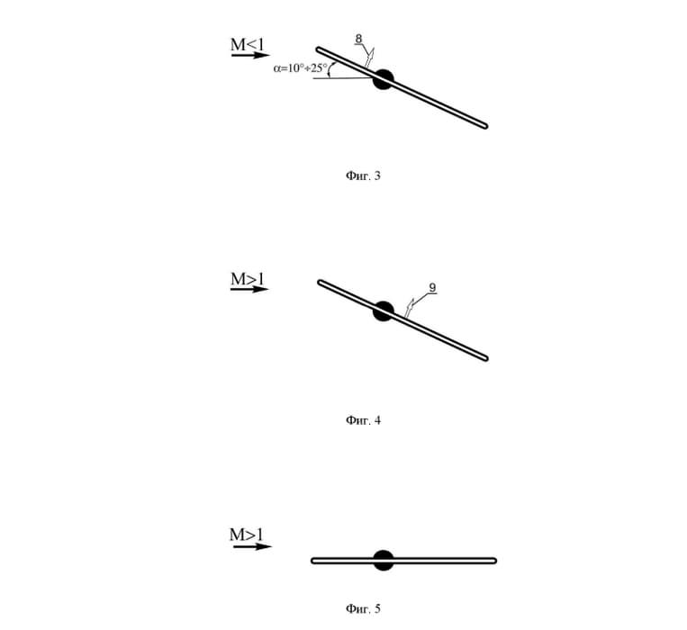 The axis of rotation is located between the centers of pressure in subsonic and supersonic flight modes. This allows the device to adapt to changes in speed.