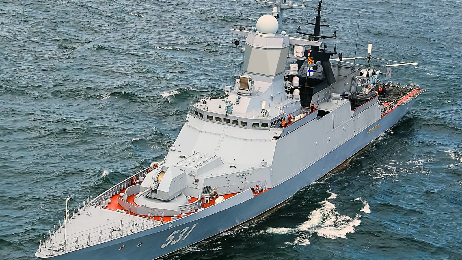 The corvette's aviation group is represented by a Ka-27PL helicopter and an "Orlan-10" UAV, which is located in the deck hangar. The ship is also equipped with missile and torpedo weapons.