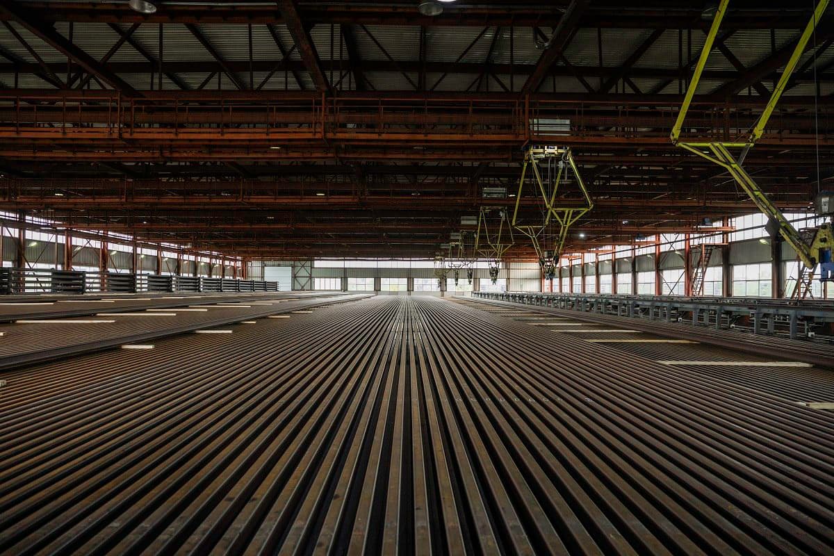 En la empresa de soldadura de rieles RSP-M, se ha comenzado a soldar tramos de riel de 800 metros de longitud para la futura línea de alta velocidad Moscú – San Petersburgo. El proceso comienza con la recepción de rieles de 100 metros, cada uno de los cuales pesa 6,5 toneladas y se introduce en la línea de producción.