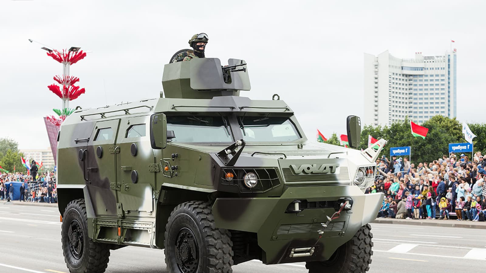 El Comité Estatal de Industria Militar de Bielorrusia mostró pruebas del vehículo blindado ligero (VBL) Volat V1, producido por la Planta de Tractores con Ruedas de Minsk, controlado a distancia. El vehículo ejecutó con éxito las órdenes del operador.