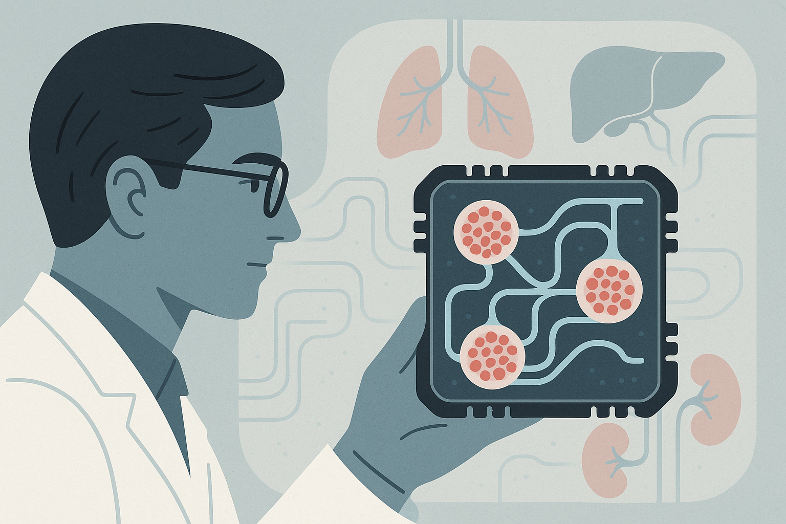 "Humano en un chip" es una plataforma de bioingeniería donde las células vivas se cultivan en microcanales de un chip por los que circulan soluciones nutritivas. Este modelo crea un entorno más natural que las pruebas tradicionales en cultivos celulares separados y permite abandonar parcialmente las pruebas en animales. Acerca la investigación al impacto real del fármaco en un órgano o en el organismo en su conjunto.