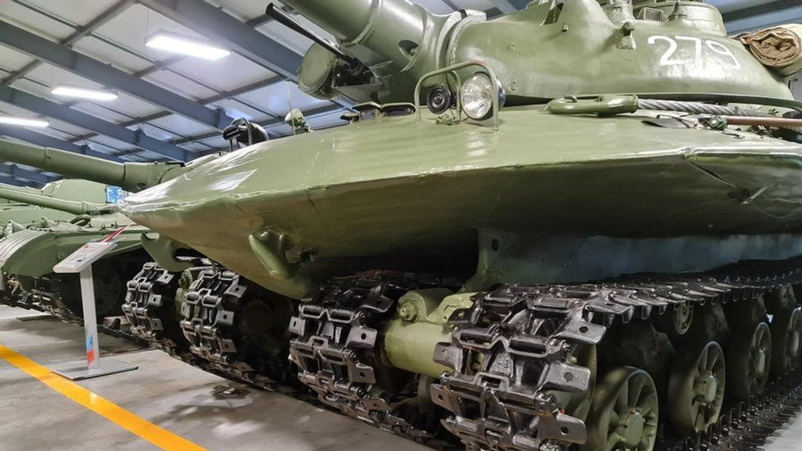 La parte inferior y el cuerpo están cubiertos con pantallas de tela de goma y bloques de protección dinámica. También se fijaron sistemas de guerra radioelectrónica en el "rey-parrilla" del tanque de asalto para suprimir los canales de control de drones y granadas de humo.