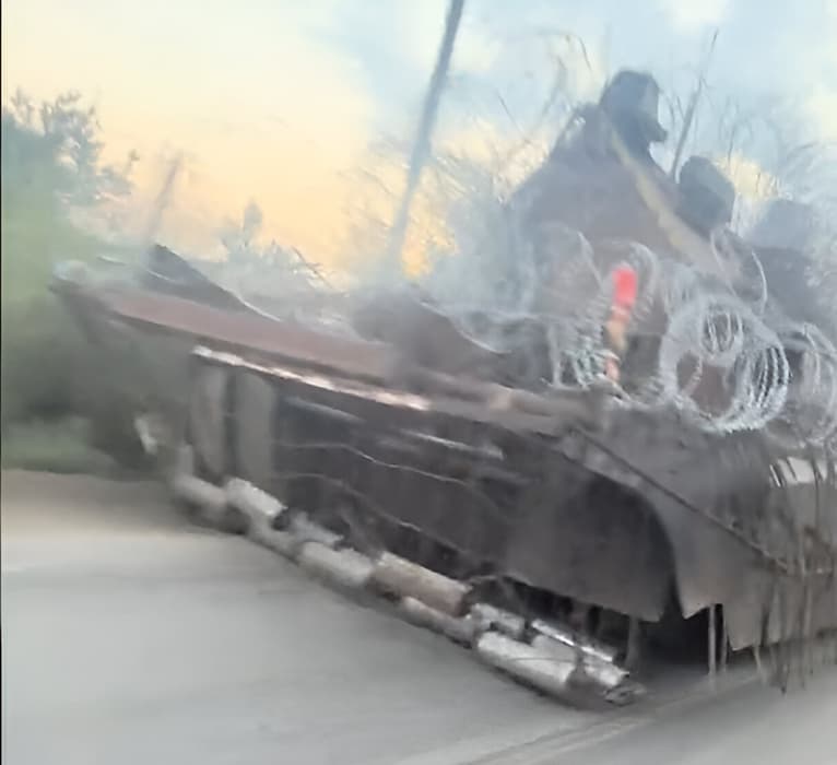 La máquina de orugas está completamente cubierta con un "rey-parrilla" de acero, debajo del cual se puede colocar infantería. Se soldaron barras de acero perpendiculares en él; sirven como soporte para rollos de alambre de púas, en los que puede atascarse un dron kamikaze.