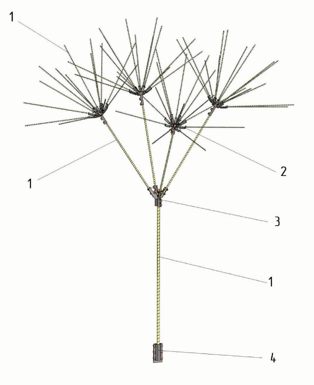 La cantidad de varillas en los niveles aumenta de abajo hacia arriba, las varillas están conectadas entre sí por elementos de conexión fácilmente desmontables. Las varillas están hechas de armadura de fibra de vidrio de diferentes secciones.
