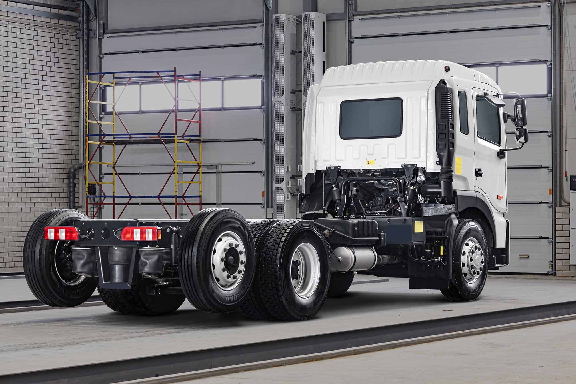 El nuevo chasis transporta hasta 13 300 kg de carga con una masa total de 19 980 kg. La carga se distribuye uniformemente entre los dos ejes traseros: cada uno soporta 7,5 toneladas. El eje giratorio redujo el radio de giro de 7,7 a 6,1 metros. El control del eje se encuentra en la cabina, y la automatización indica cuándo desconectarlo para no perder el control a alta velocidad.