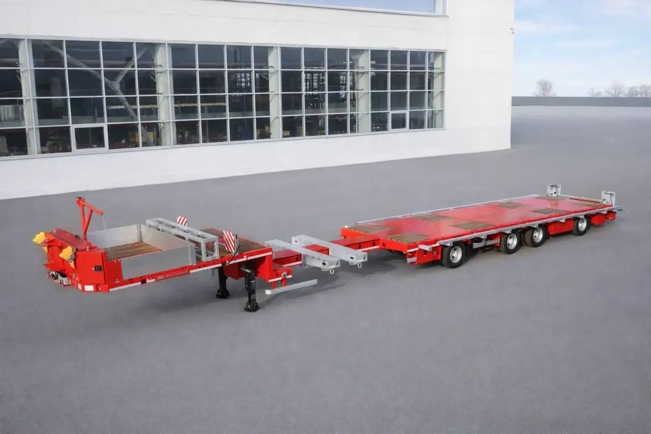 Para el equipo se han pensado muchos detalles para facilitar el trabajo. Por ejemplo, aquí se han instalado 56 puntos de fijación de la carga y se han colocado rampas de acceso hechas de aleación ligera. Los ingenieros han equipado el semirremolque con un sistema electrónico de frenos EBS y tecnología de iluminación LED. También está disponible la función de ajuste de la carga en el primer eje, lo que ayuda a distribuir correctamente el peso entre el tractor y el remolque. El modelo es adecuado para equipos de construcción, viales y agrícolas, así como para tuberías, vigas y contenedores. Todo el equipo ha sido probado para garantizar su fiabilidad y está listo para condiciones de funcionamiento difíciles.