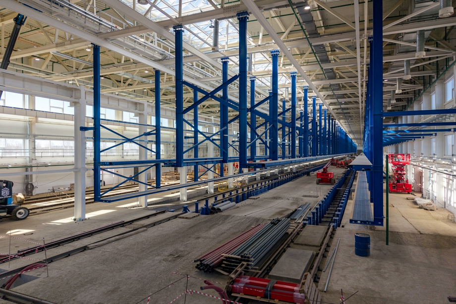 El edificio mas largo, destinado a la conformacion de componentes de la carroceria, alcanza los 420 metros. Alli ya se han entregado por completo los cimientos para la instalacion del equipamiento tecnologico, se estan ejecutando los sistemas de ventilacion y extincion de incendios, y se esta realizando el vertido de los pisos de acabado. En el taller vecino, de 378 metros de longitud, destinado a la puesta en marcha y ajuste de los trenes electricos, al mismo tiempo se estan tendiendo las vias ferroviarias y se estan instalando las redes electricas. En el sitio del centro de ingenieria, los trabajos monoliticos finalizaran para el 1 de mayo, tras lo cual comenzara la instalacion de los sistemas de ingenieria.