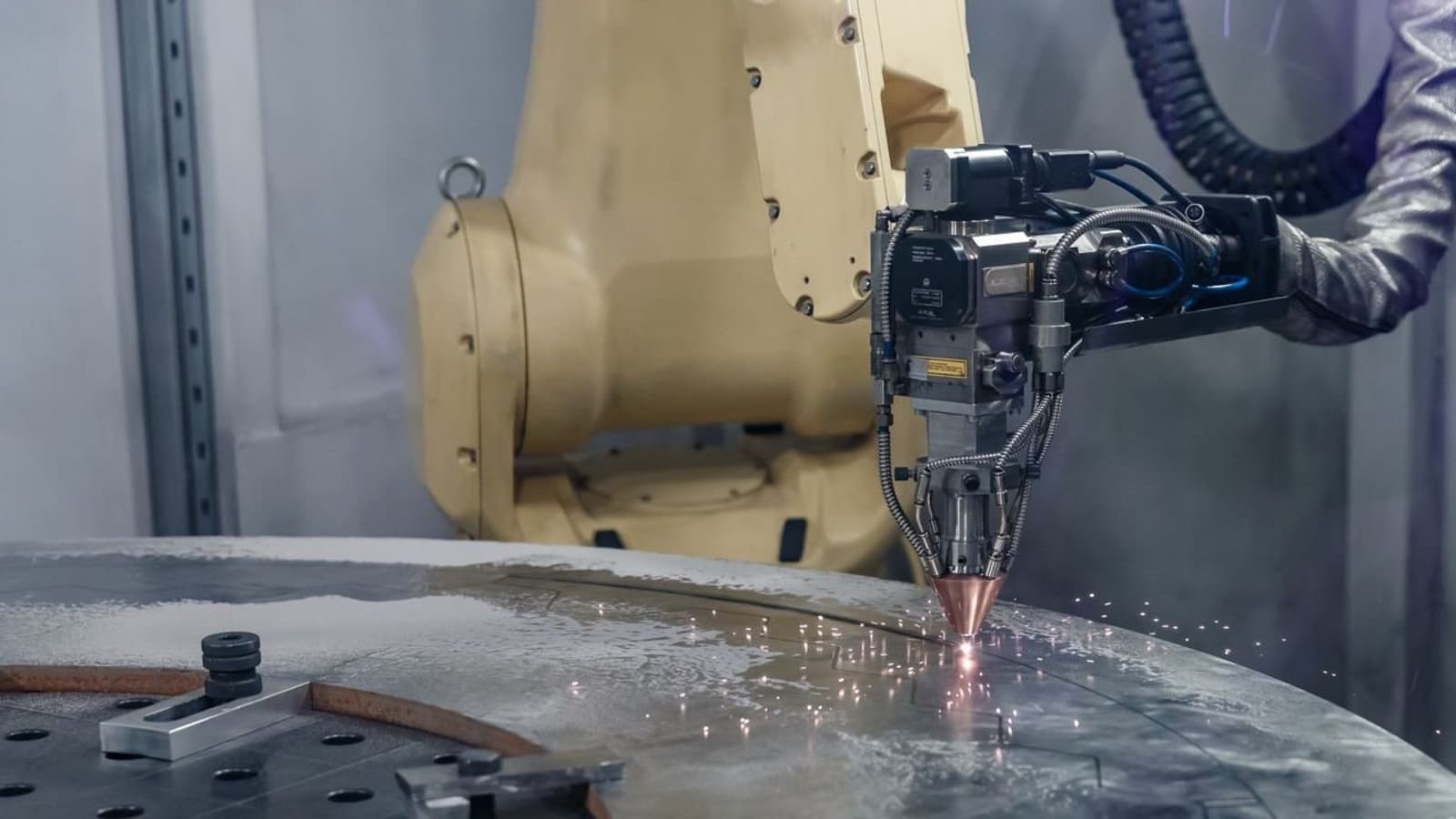 Устройство работает по технологии прямого лазерного выращивания (ПЛВ/DMD). Оно предназначено для изготовления изделий с максимальным диаметром 2200 мм и высотой 1000 мм. Установка оснащена двумя промышленными 6-осевыми роботами и позиционером грузоподъемностью до 8000 кг.