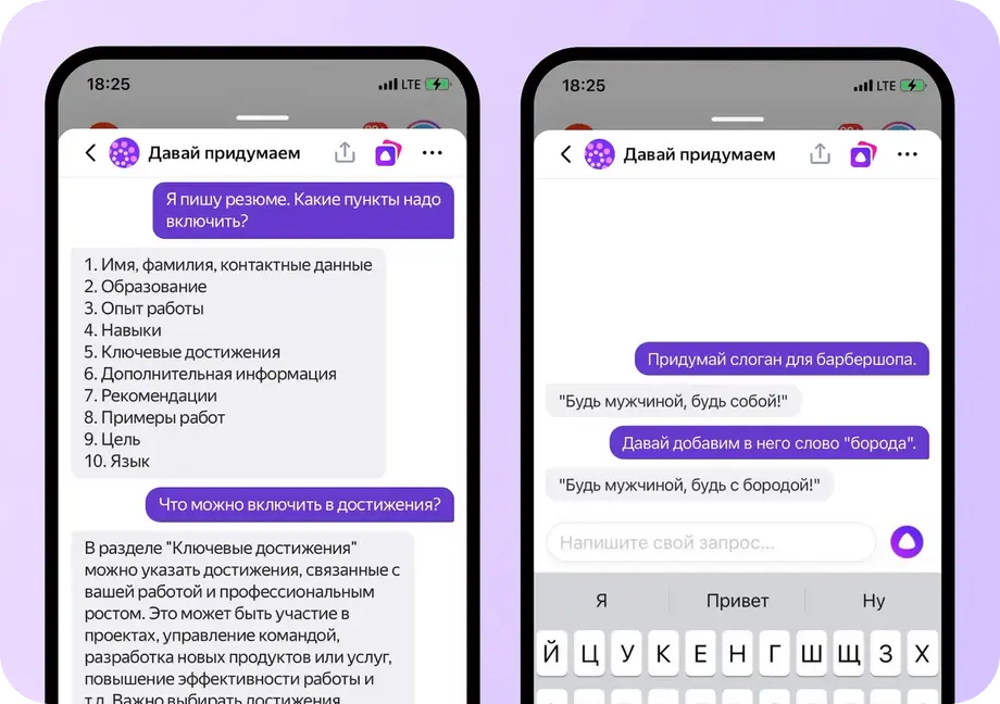 «По просьбе пользователя Алиса может дать совет, выступить в роли делового партнёра или соавтора. Например, с ней можно обсудить бизнес-план, сравнить все «за» и «против» покупки машины или подготовиться к собеседованию. Она будет вместе с вами придумывать слоганы, идеи для стартапов и десятки вариантов постов для разных аудиторий», — рассказали в «Яндексе».