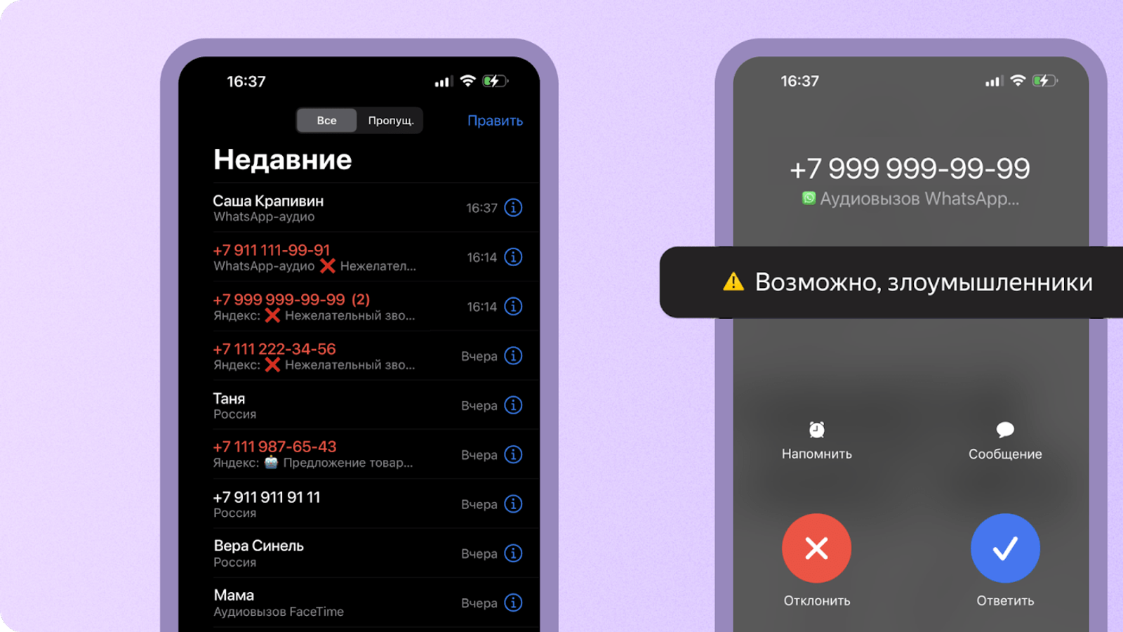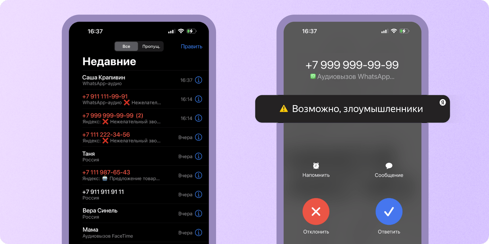 Автоматический определитель номера в приложении "Яндекс с Алисой" научился предупреждать пользователей о нежелательных вызовах в мессенджерах. Аналитики "Яндекса" отмечают, что спамеры и мошенники беспокоят людей через мессенджеры всё чаще, и количество жалоб на это растет. Новая функция определителя уже работает на iOS и Android в WhatsApp и Viber.