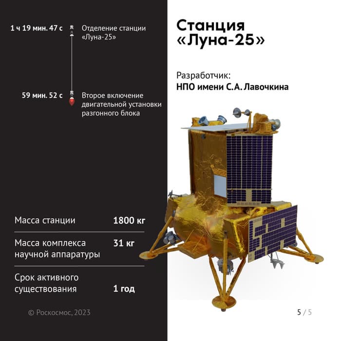 Ракета отработала в штатном режиме. Примерно через час после пуска «Луна-25» отделилась от разгонного блока «Фрегат» — он вывел автоматическую станцию на траекторию перелёта к Луне.