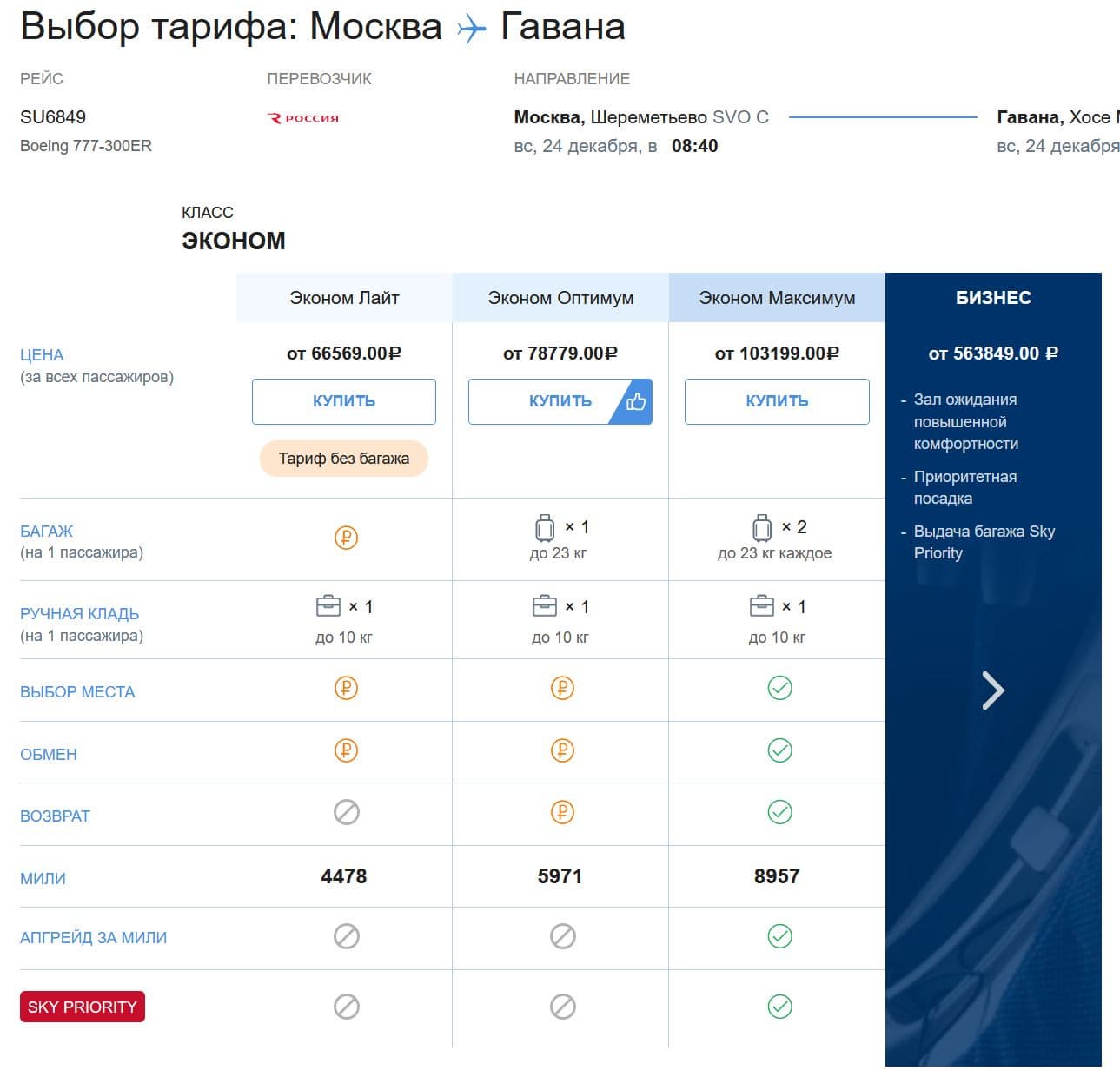 Для полетов в Гавану будет использоваться авиалайнер Boeing 777-300ER. Стоимость билета – от 66,5 тыс. рублей в эконом-классе и до 617 тыс. рублей в бизнес-классе. Забронировать и купить билеты можно как на сайте «Аэрофлота», так и в мобильном приложении, а также в офисах продаж.