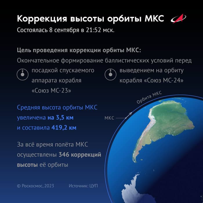 Увеличение высоты орбиты на 3,5 километра было проведено для формирования баллистических условий перед стыковкой с пилотируемым космическим кораблем «Союз МС-24» и отстыковкой и возвращением корабля «Союз МС-23».