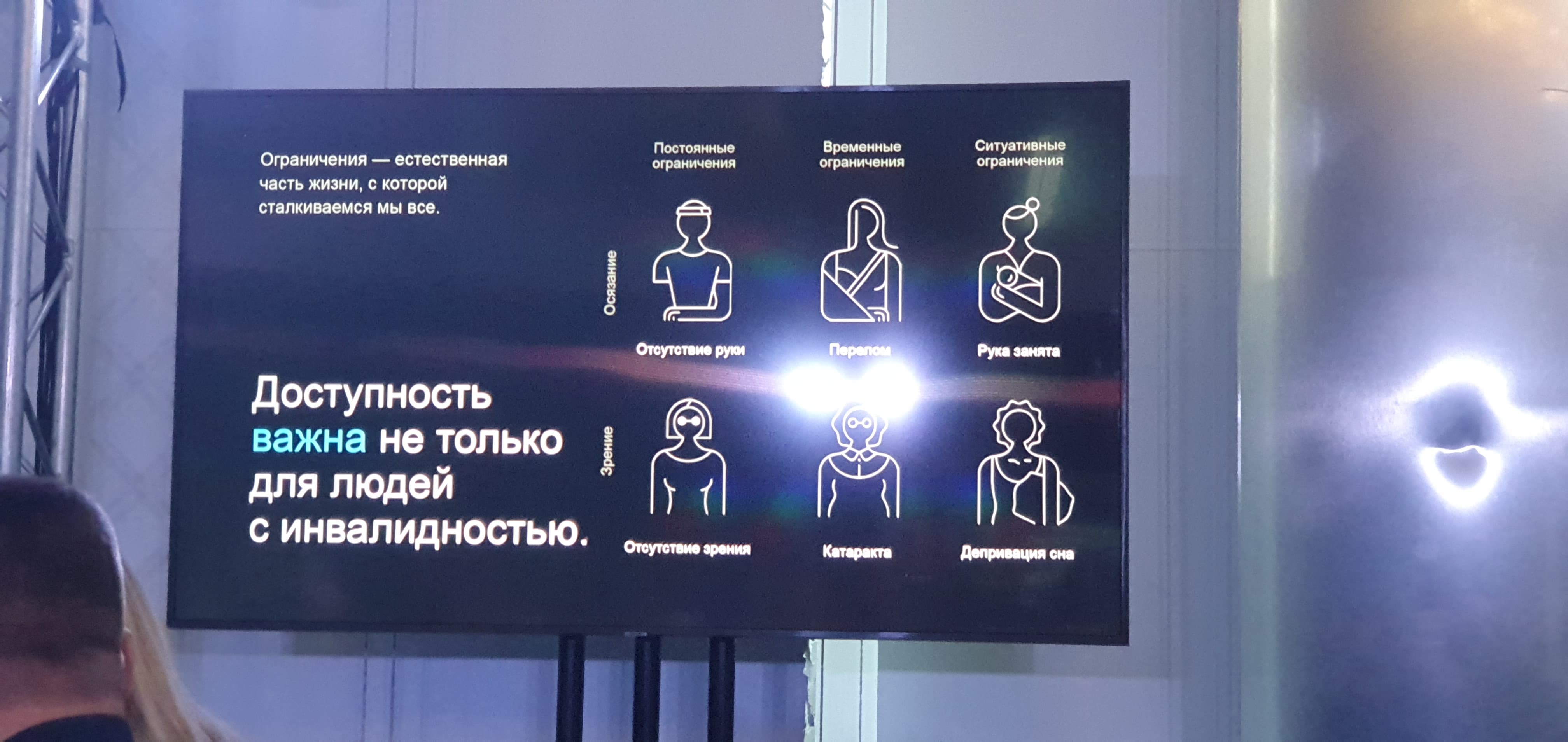 Во-вторых, бывают ситуативные трудности ограниченных возможностей. Например, если человек забывает свои наушники по дороге из дома на работу в метро, то он на время условно ограничен в слухе и не может посмотреть какое-либо видео без субтитров. А если у пользователя случились проблемы со сном или разгульная ночь, то утром при использовании какого-то приложения у него могут быть когнитивные искажения.