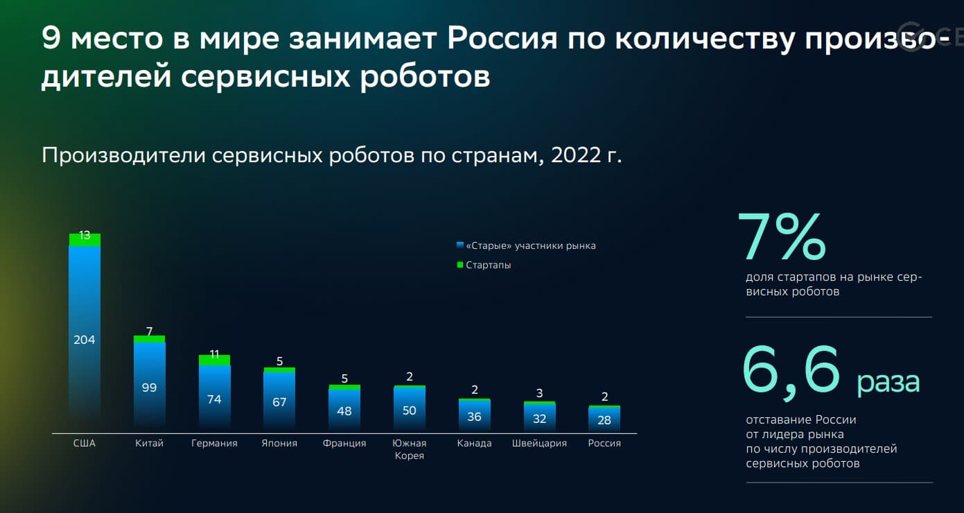 В мире действует порядка 3,9 млн промышленных роботов. Россия занимает 9 место в рейтинге стран по числу производителей сервисных роботов. Первое место принадлежит США. В отчете указывается, что фонд «Сколково» делает большой вклад в развитие отечественной индустрии сервисной робототехники.