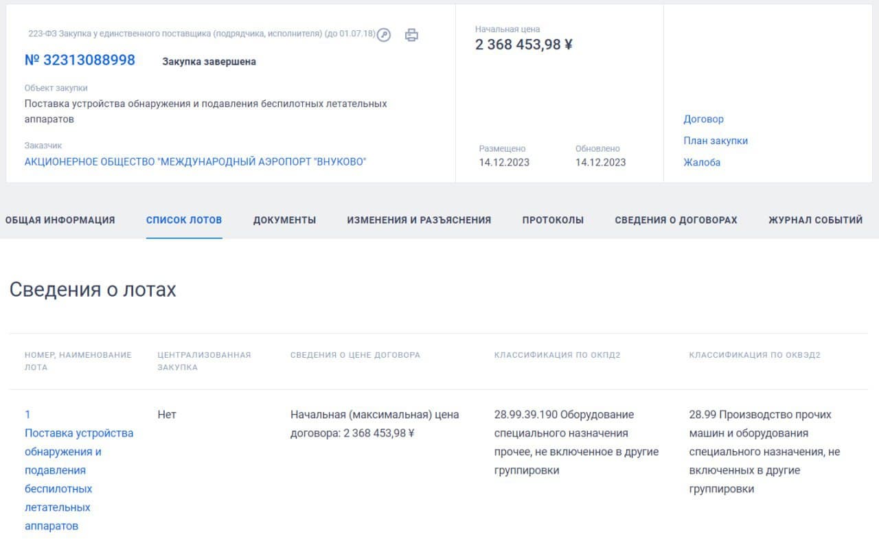 Согласно этим данным, планируется закупить 5 единиц антидронного оборудования. Общая сумма контракта составляет порядка 29,7 млн руб. или 2,3 млн юаней.