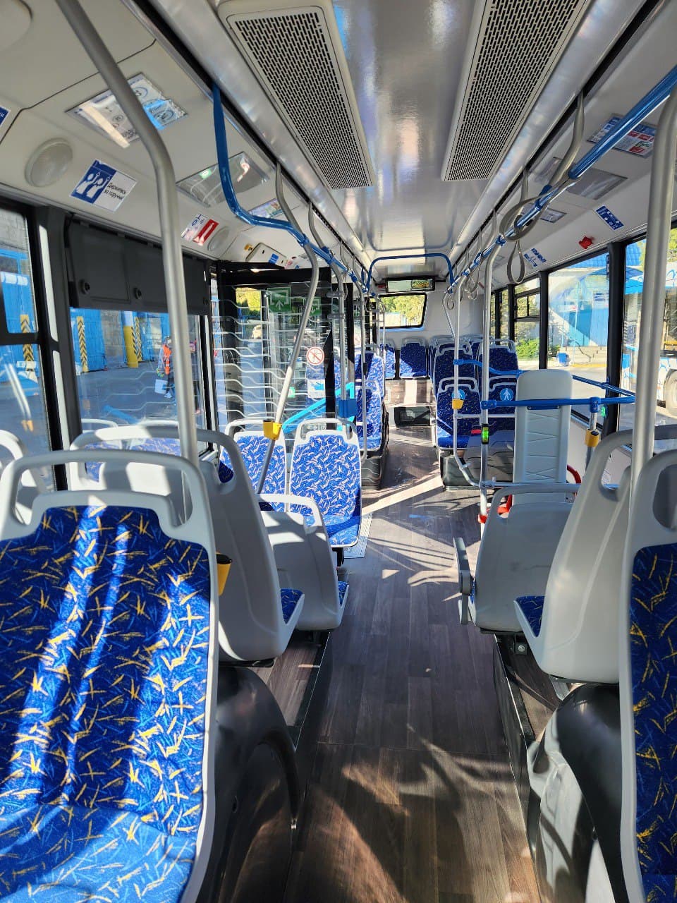 Электробус низкопольный, издает меньше шума и максимально адаптирован под разные категории пассажиров и их нужды. В нем есть Wi-Fi и зарядки для телефона, откидная аппарель для въезда коляски и кнопки вызова водителя, если пассажир имеет малую мобильность.