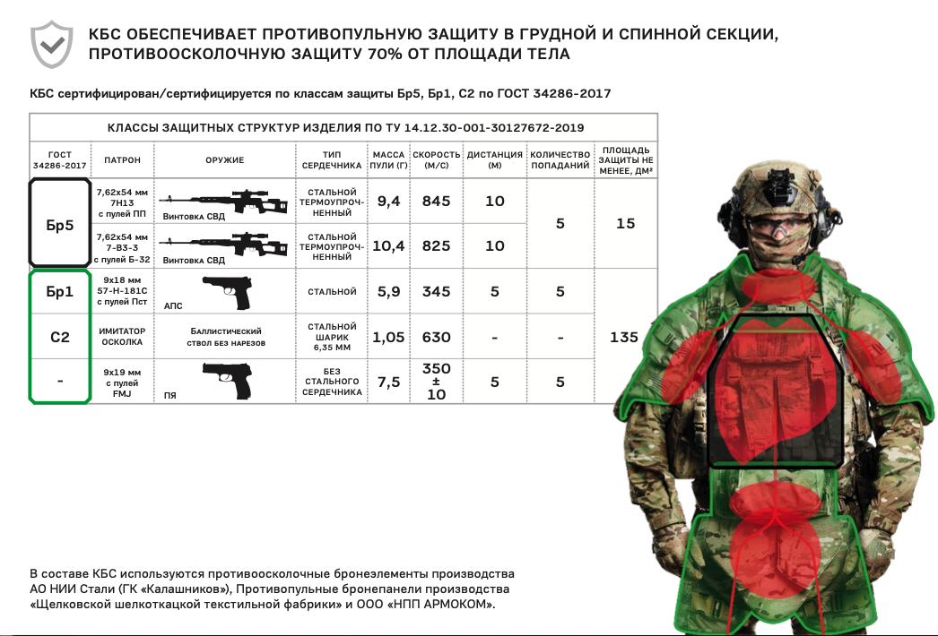 КБС «Стрелок» обеспечивает противопульную защиту в грудной и спинной секции, а также увеличенную площадь противоосколочной защиты, составляющую более 135 дм², что равно 70% от площади тела. Это ставит комплект в ряд передовых решений в сфере бронезащиты.