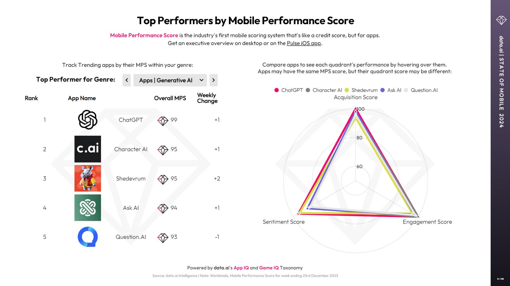 Data.ai оценивает приложения по собственной метрике Mobile Performance Score. Она подсчитывает для приложений количество его загрузок и пользователей (acquisition), вовлеченность аудитории (engagement) и оценки пользователей (sentiment). Потом по каждому из этих параметров ИИ-алгоритмы Data.ai дают приложению оценку по шкале от 1 до 100 баллов. Для «Шедеврума» совокупность баллов по трем позициям составила 95 баллов из 100.