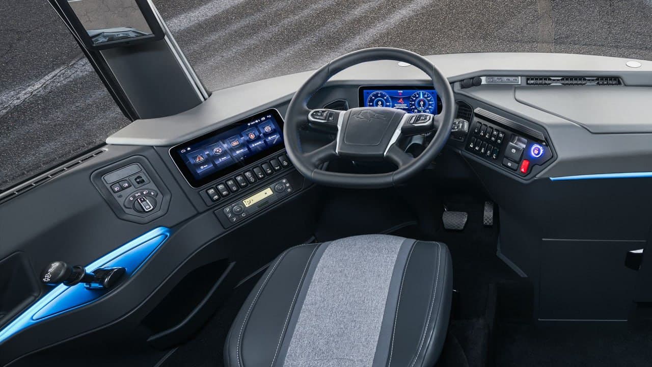 Кузов тягача сделали эргономичным, убрав зеркала заднего вида. Их заменили экранами на передних стойках кабины, куда выводится изображение с камер заднего вида.