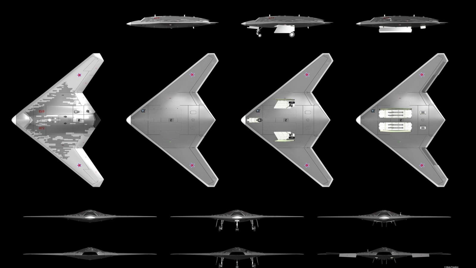 БПЛА разработан в ОКБ Сухого, а выпускается на новосибирском заводе (входит в ОАК). Предположительно, «Охотники» будут нести управляемые ракеты, бомбы во внутреннем отсеке, а также на подкрыльевых узлах подвески.
