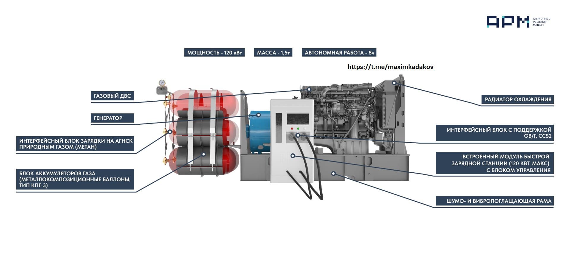 В качестве основного топлива в установке будет использоваться сжатый природный газ, что соответствует уровню экологичности ЕВРО-5. Устройство - мощностью до 125 киловатт-час сможет автономно работать до 8 часов или отработать пятнадцать зарядных сессий. Газовую нехватку можно будет восполнить на газовой заправочной станции в течение 15 минут.