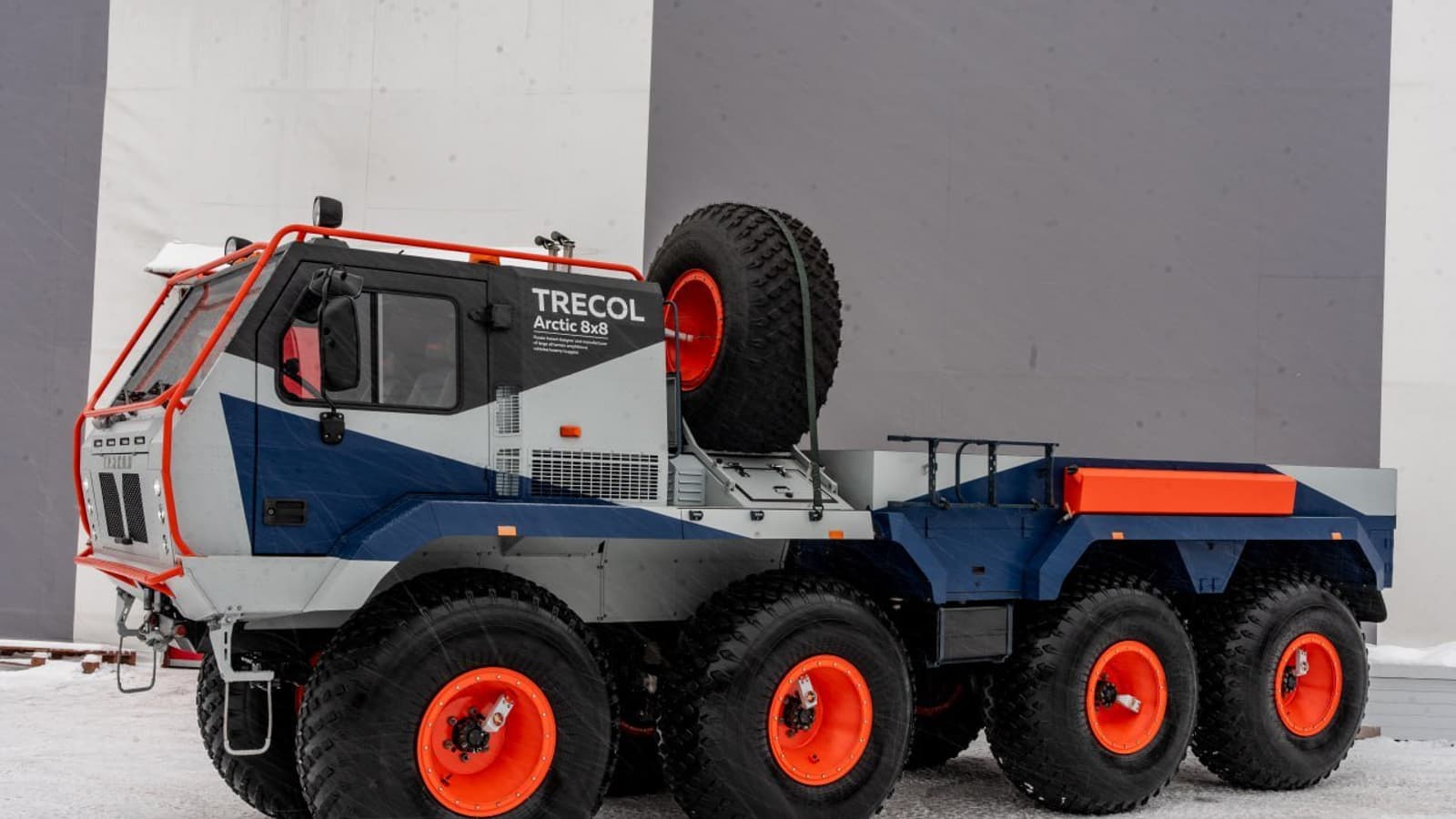 Подмосковная компания «Трэкол» представила мощный снегоболотоход Трэкол Арктика Пикап с колесной формулой 8х8 на шинах сверхнизкого давления 1600х700-635. Вездеход представлен в комбинированной расцветке.