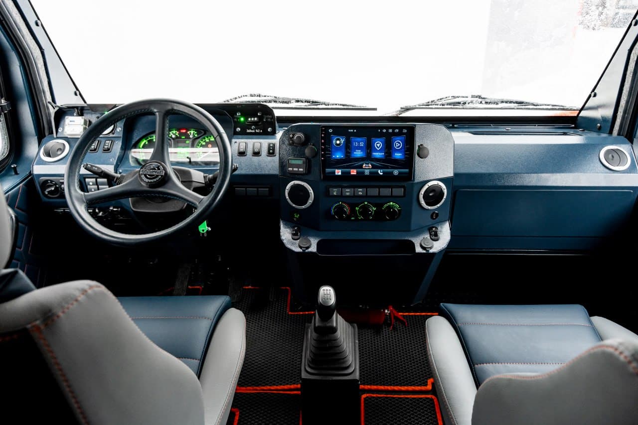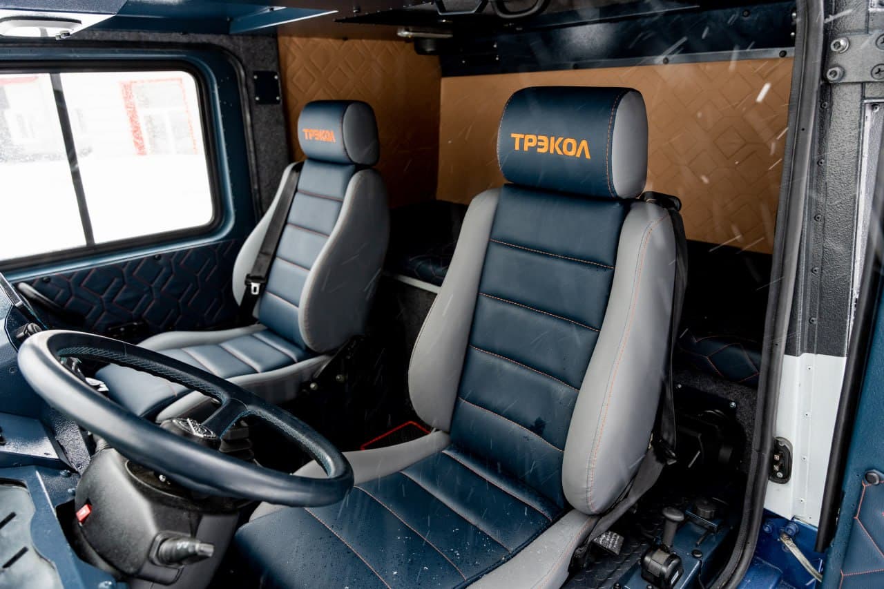Вездеход получил оригинальное шасси с рамой, а также грузовую платформу из алюминиевых сплавов. Утепленная кабина отличается особым комфортом - мягкие кресла, удобное расположение руля и мультимедийной системы.