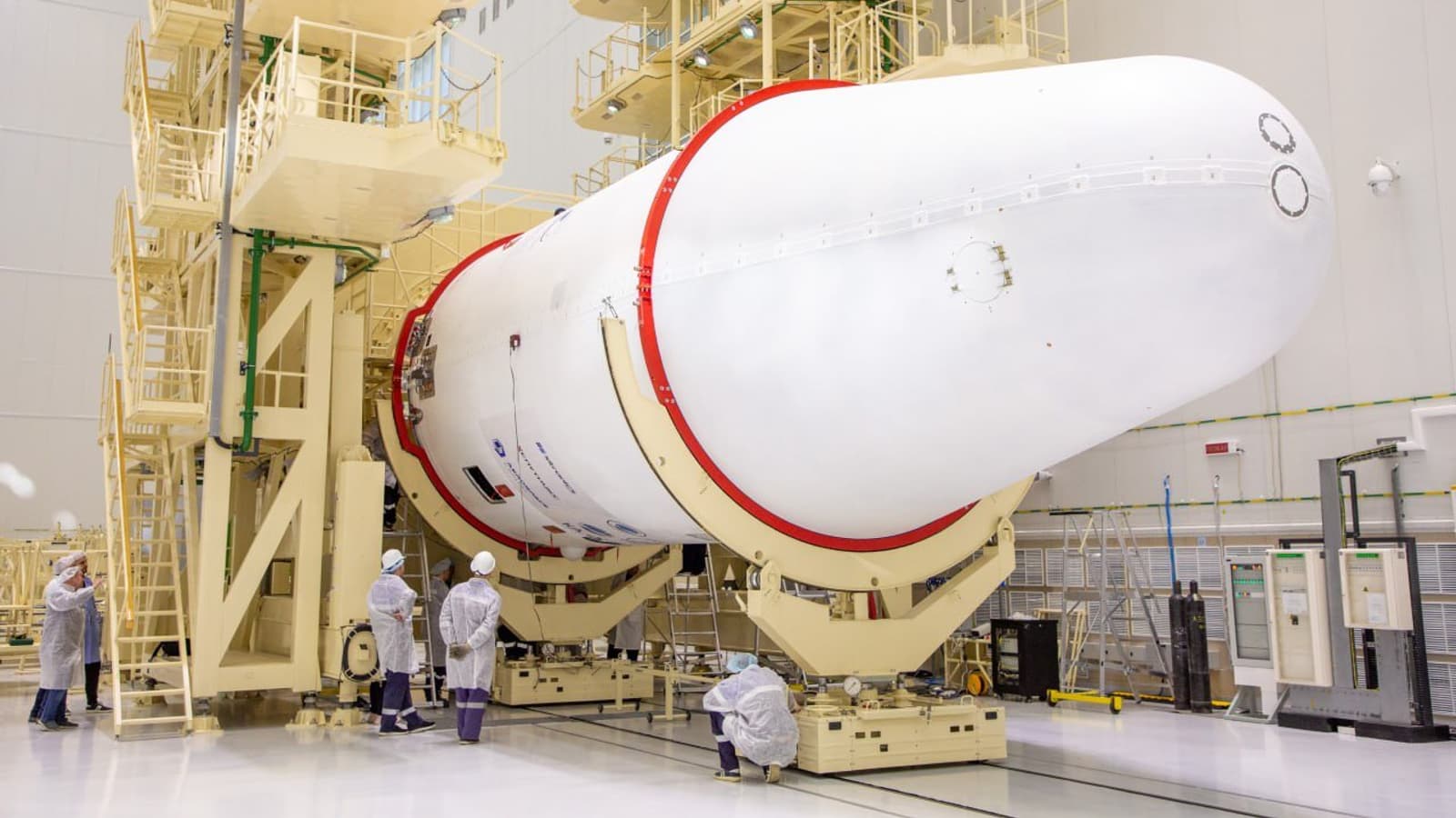 Уже проведена накатка головного обтекателя на космические аппараты и разгонный блок «Фрегат». Теперь космическую головную часть переложат на транспортировочную телегу, и отправят через трансбордерную галерею в МИК ракеты-носителя для стыковки с третьей ступенью «Союза».